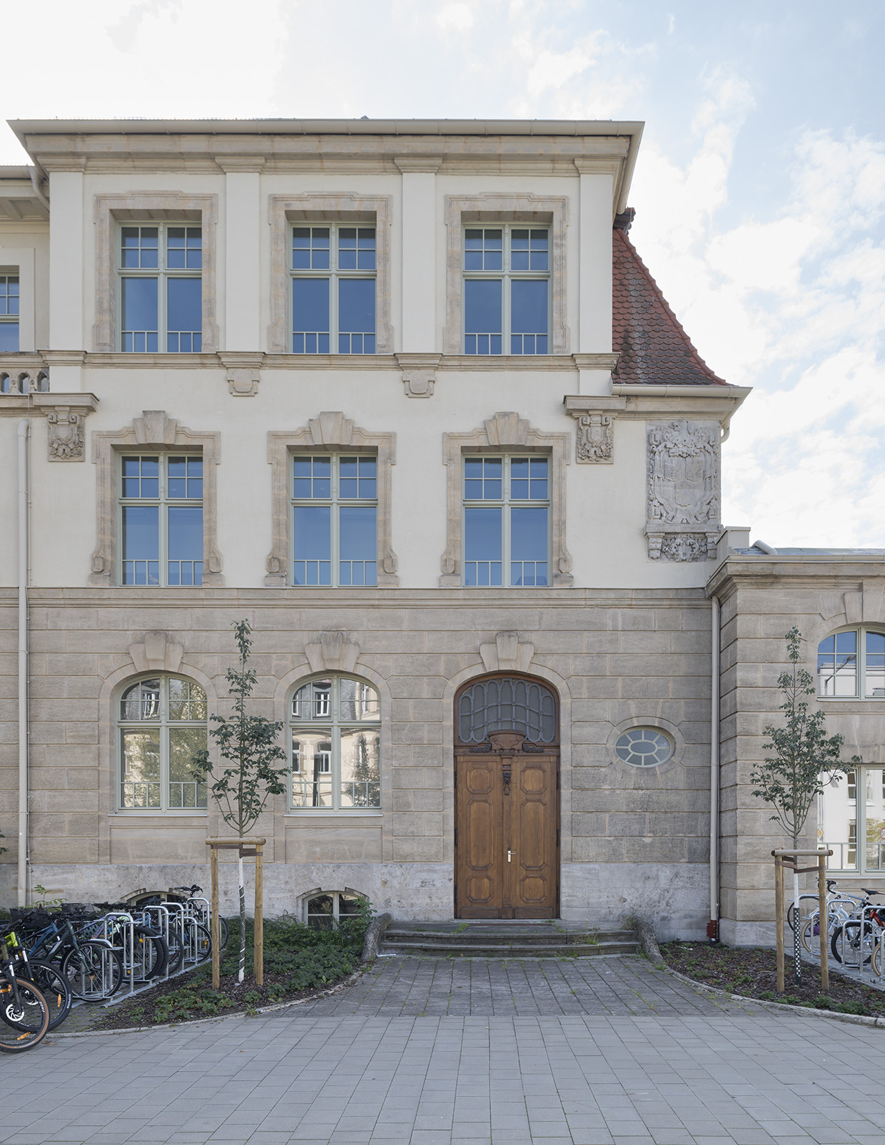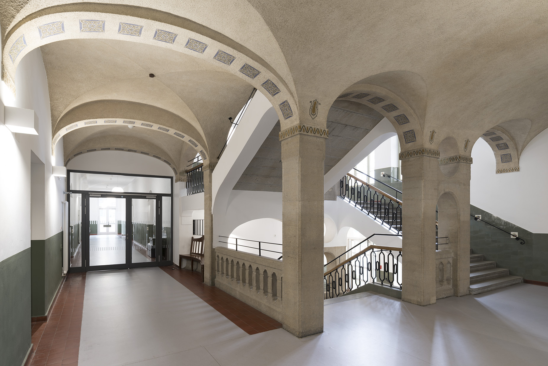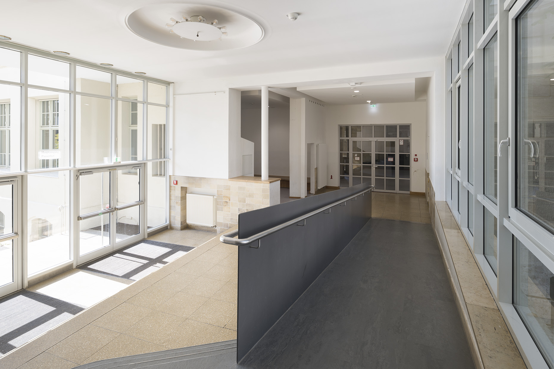 Die Umsetzung dieser Generalsanierung eines historischen Gebäude erfolgte bei laufendem Schulbetrieb unter Berücksichtigung bauhistorischer Merkmale wie z. B. Holzfenster und Sandsteinfassade.